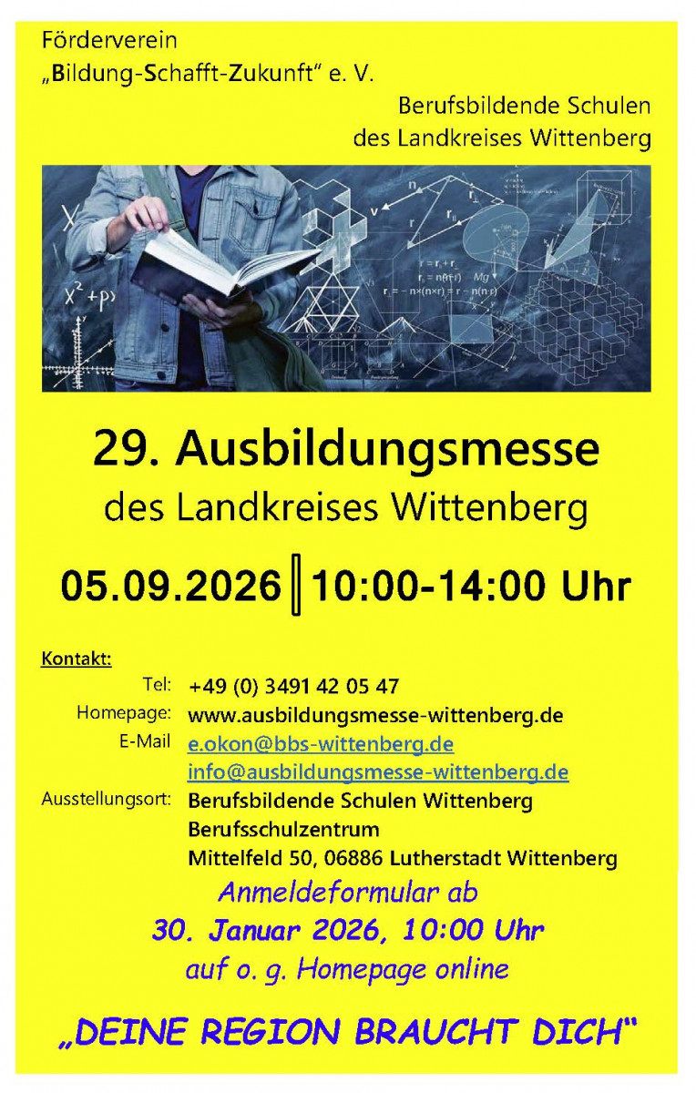Ebenfalls am 05. September 2026 findet auch der alljährliche „Tag der offenen Tür“ der Berufsbildenden Schulen Wittenberg statt, an dem sich Interessierte über die angebotenen Bildungsgänge vor Ort informieren können. |